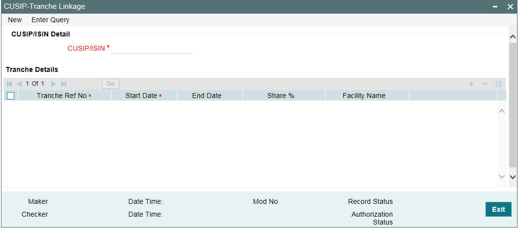 Specify the unique reference number indicating the facility to be associated with the deal. You can specify either a new CUSIP number or an existing CUSIP whose details have already been captured in the LB module.