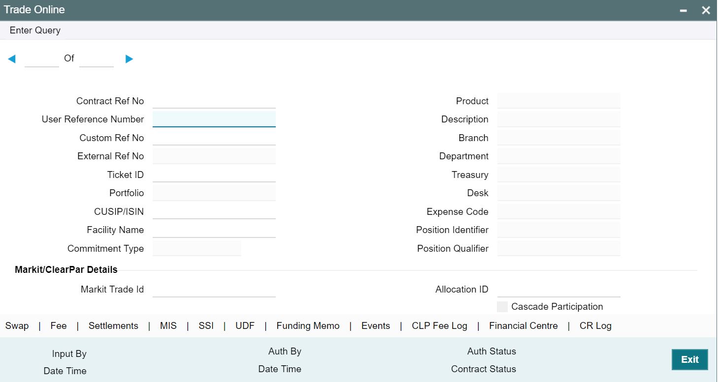 You can invoke the ‘Trade- Online’ screen by typing ‘TLDTDONL’ in the field at the top right corner of the Application tool bar and clicking on the adjoining arrow button.