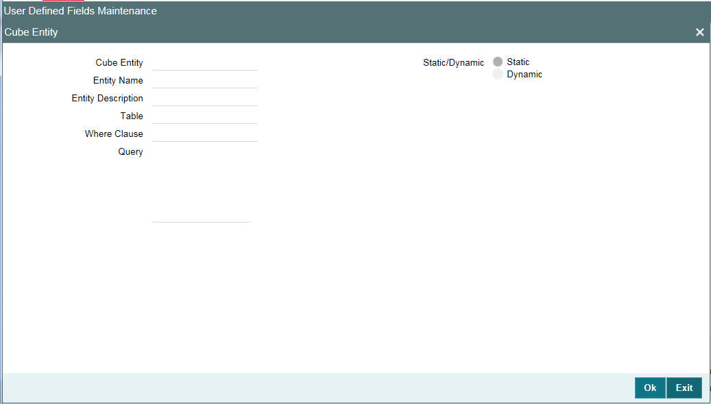 If the field type is ‘Cube Entity’, the values of a field can be selected from Oracle Lending tables. If you select the field type as ‘Cube Entity’, the ‘Cube Entity’ screen is displayed.
