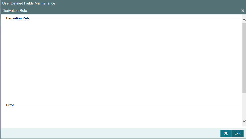 Select the ‘Derivation Allowed’ option, if you want the values of a UDF to be populated based on certain conditions. According to the requirements of the bank, the implementer of Oracle Lending writes a PL/SQL code to populate the values of the user defined field. The values of the UDF are displayed in the ‘User Defined Field/Field Name to Value Definition’ screens of Contract Input or Function Id screen.