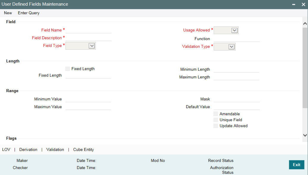 Based on your requirement and the nature of the field, you can specify default values and validations for the field. Oracle Lending validates all entries made to the field with the validations you define for a field. You can invoke the ‘User Defined Fields Maintenance’ screen by typing UDDUDFMT’ in the field at the top right corner of the Application tool bar and clicking on the adjoining arrow button.