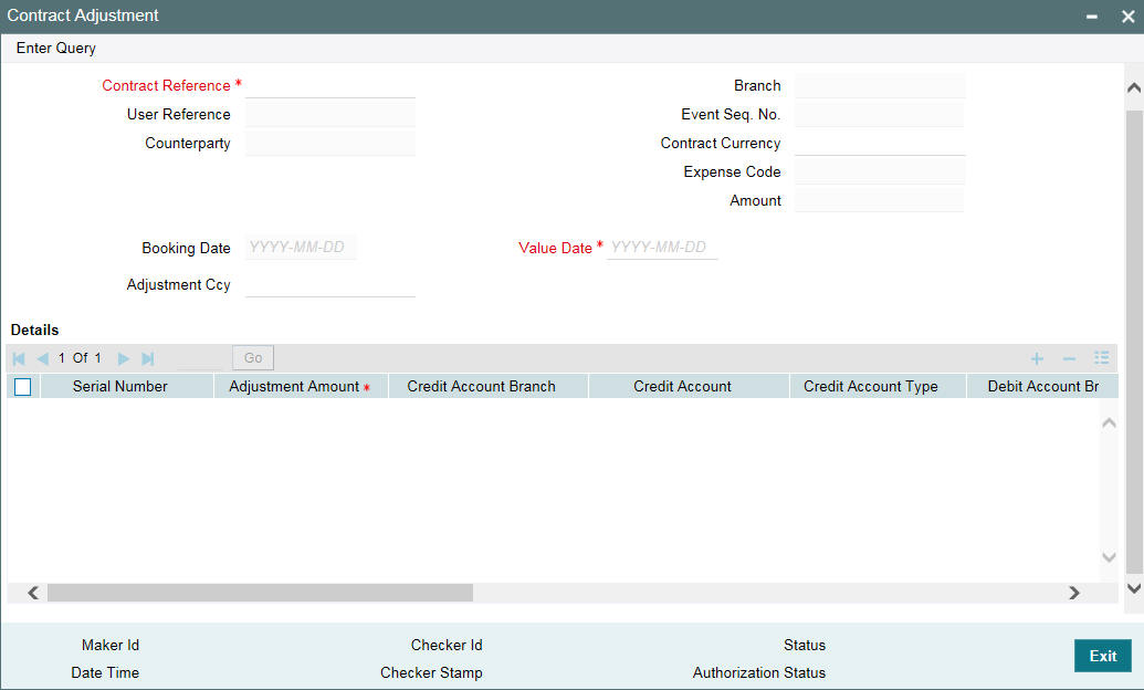 After you enter ‘Module’, ‘Branch’, ‘Product Code’, and ‘Contract Reference’, then you can view the ‘Override Details’ and ‘Authorization Details’ section.