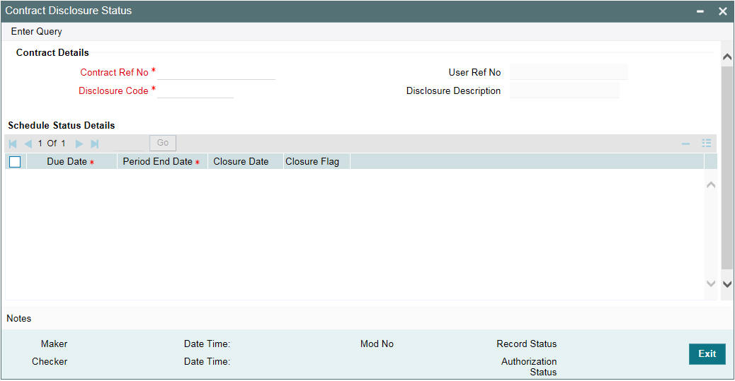 Specify the disclosure code for which you want to query the details. This adjoining option list displays the all the disclosure codes that are linked to the contract and you can choose the appropriate one.