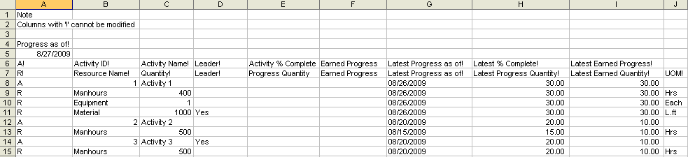 In the example, notice that the first column is named Progress as of!. This date is used as a timestamp on the progress information. There are two headers in this example file: