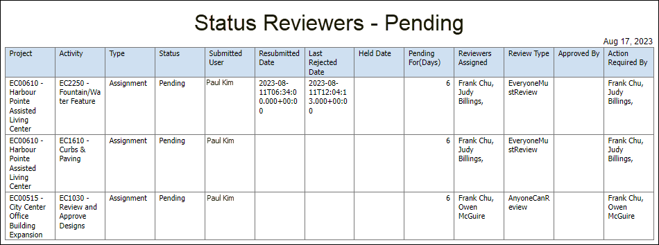 Lists status updates in a pending state showing which project and activity the status update was submitted against, the assignment level (activity or assignment), and current status of the update. Also lists the user who submitted the update, the date the update was submitted and, if applicable the date of resubmission, the most recent date the update was rejected, the date the update was put on hold, the duration for which the update has been in a pending state, the reviewers assigned to the project, the review type, who the status update was approved by, and the names of the users for whom action is outstanding.