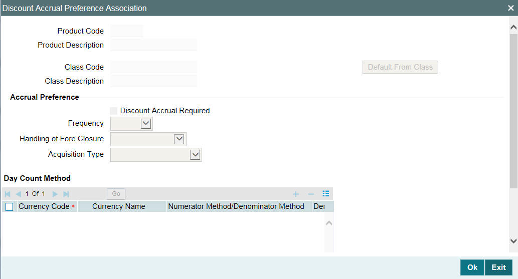 After building discount accrual fee classes you can associate the class with loans or bills products. Click the ’Discount Accrual’ in the ‘Product Definition’ screen. The ‘Discount Accrual Preference Association’ screen is invoked.