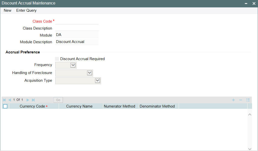 You can invoke the ‘Discount Accrual Maintenance’ screen by typing ‘OLDACRCL’ in the field at the top right corner of the Application tool bar and clicking the adjoining arrow button.