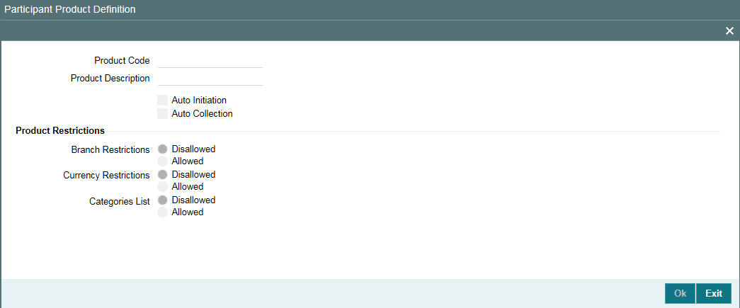 Click ‘Ok’ to proceed with product creation. The ‘Loans Syndication – Participant Product Definition’ screen is displayed.