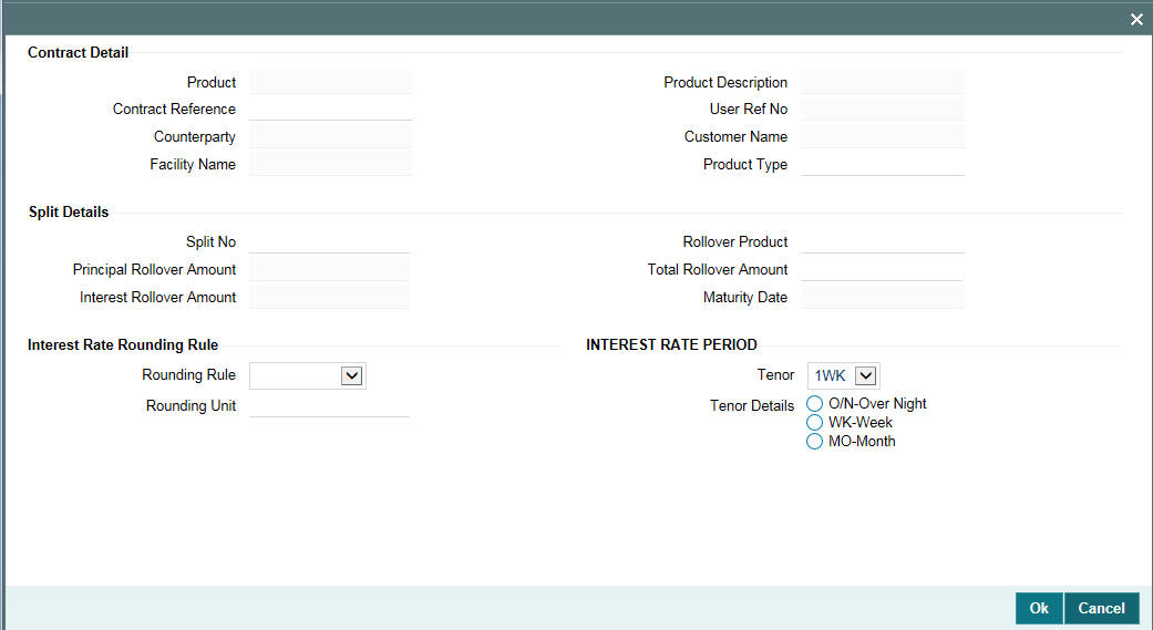 RFR (Risk Free Rate) is supported for Split Rollover, and Consolidated Rollover. The system allows you to modify the default RFR parameters maintained at product-level during Split Rollover and Consol Rollover operations. For more information on RFR, refer to Interest User Guide.