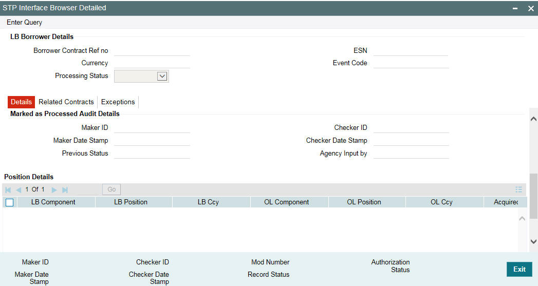 You can view the outstanding position of each LB contract and that of the corresponding commitment/loan contract in the ‘Position Details’ section. Scroll down in the ‘STP Interface Browser Detailed’, to view component-wise position