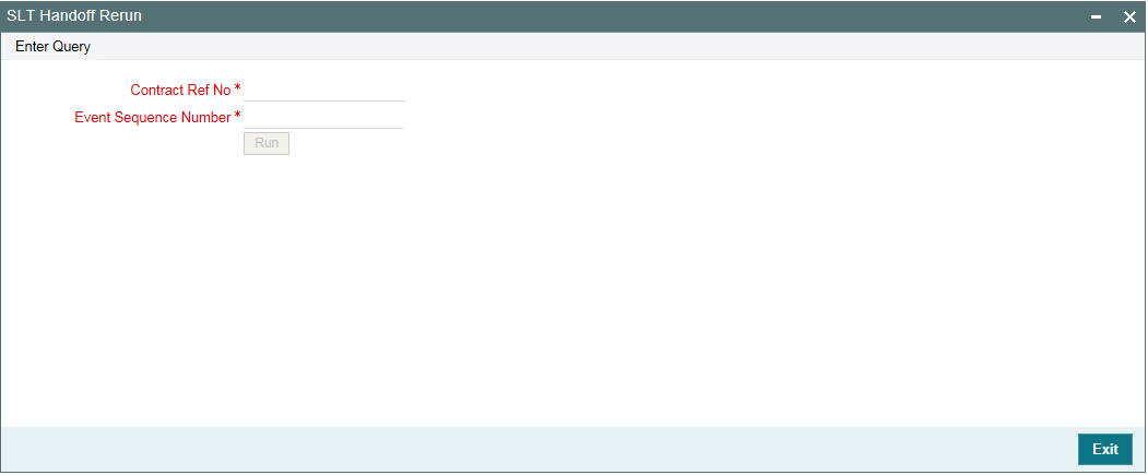 You can re-run the handoff for such contracts in the ‘SLT Handoff Rerun’ screen. You can invoke the ‘SLT Handoff Rerun’ screen by typing ‘LBDLTHOF’ in the field at the top right corner of the Application tool bar and clicking on the adjoining arrow button.