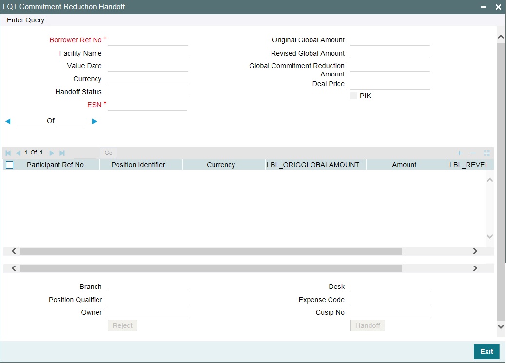 These commitment reductions details can be handed off to the external system Loans QT using the ‘Commitment Reduction Handoff’ screen.