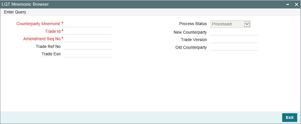 You can view the trade details which are not settled with the process status as ‘Unprocessed’ in the ‘LQT Mnemonic Browser’ screen for trade for which counterparty mnemonic is amended. You can invoke the ‘LQT Mnemonic Browser’ screen by typing ‘TLDCPMND’ in the field at the top right corner of the Application tool bar and clicking on the adjoining arrow button.