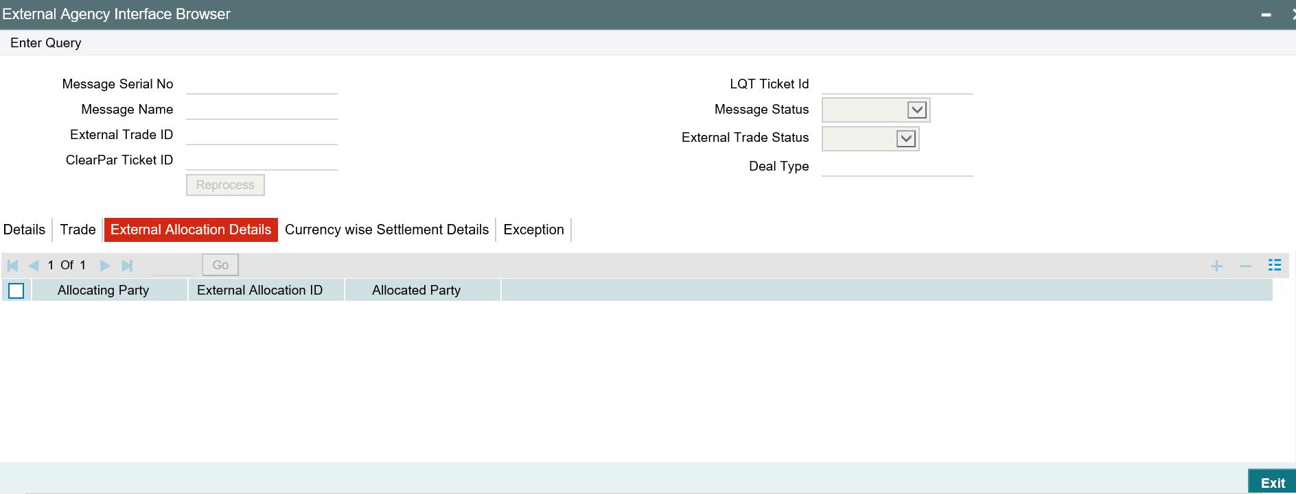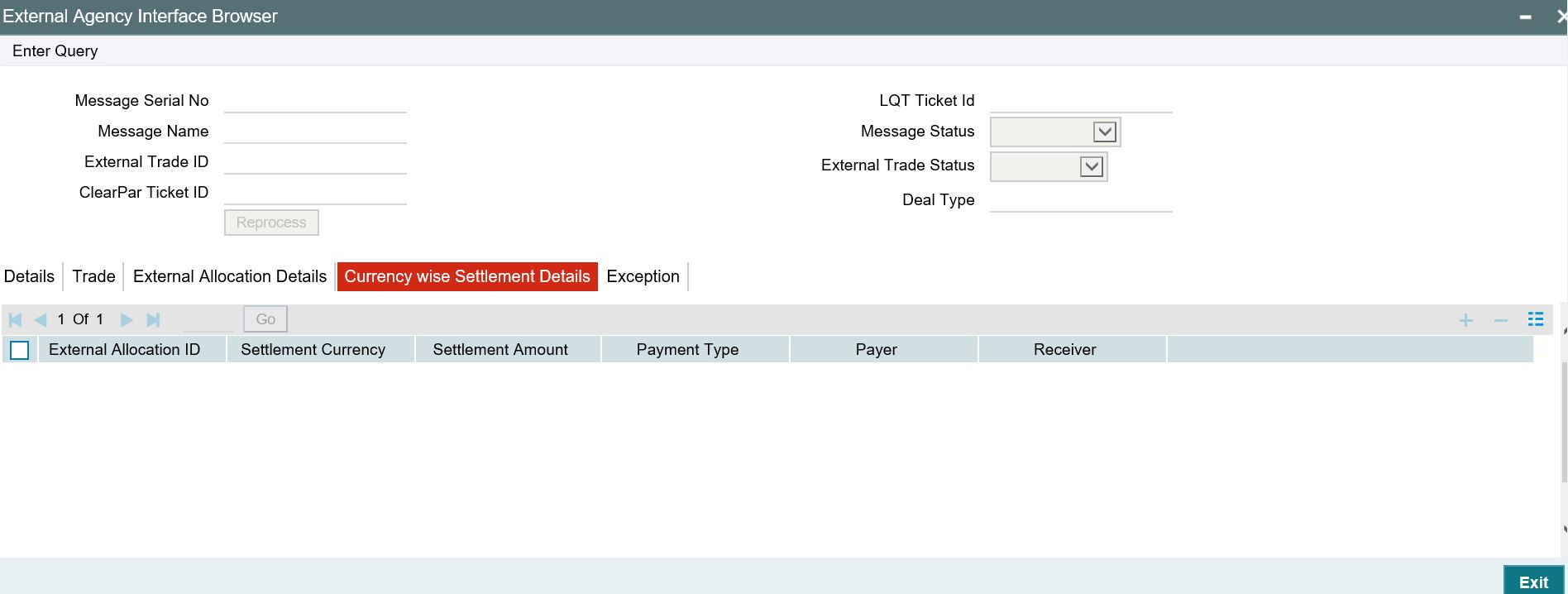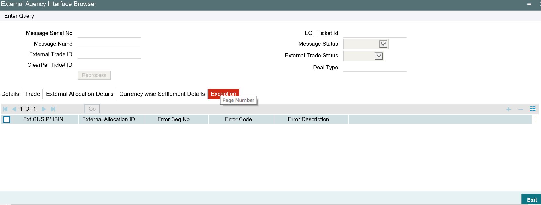 You can view the exception details for any trades in Rejected/Failed status using the ‘Error Messages’ screen. To invoke this screen, click the ‘Exceptions’ tab in the ‘Automated Settlement Queue Detailed’ screen.