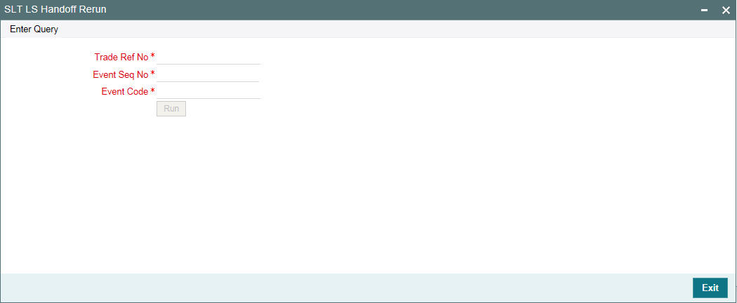 You can re-run the handoff in the ‘SLT Handoff Rerun’ screen. You can invoke the ‘SLT Handoff Rerun’ screen by typing ‘TLDREHOF’ in the field at the top right corner of the Application tool bar and clicking on the adjoining arrow button.