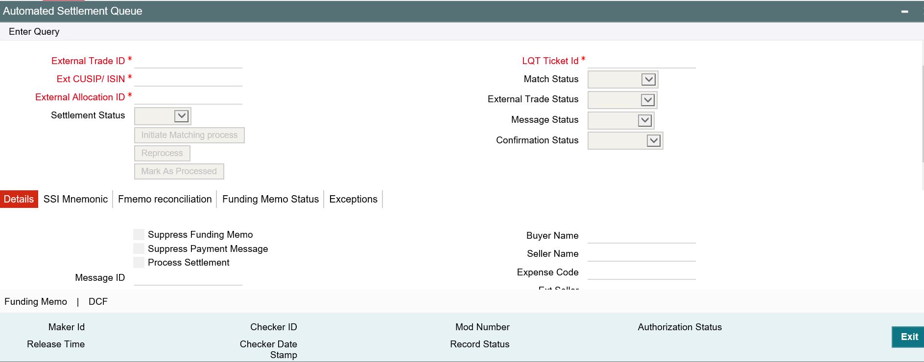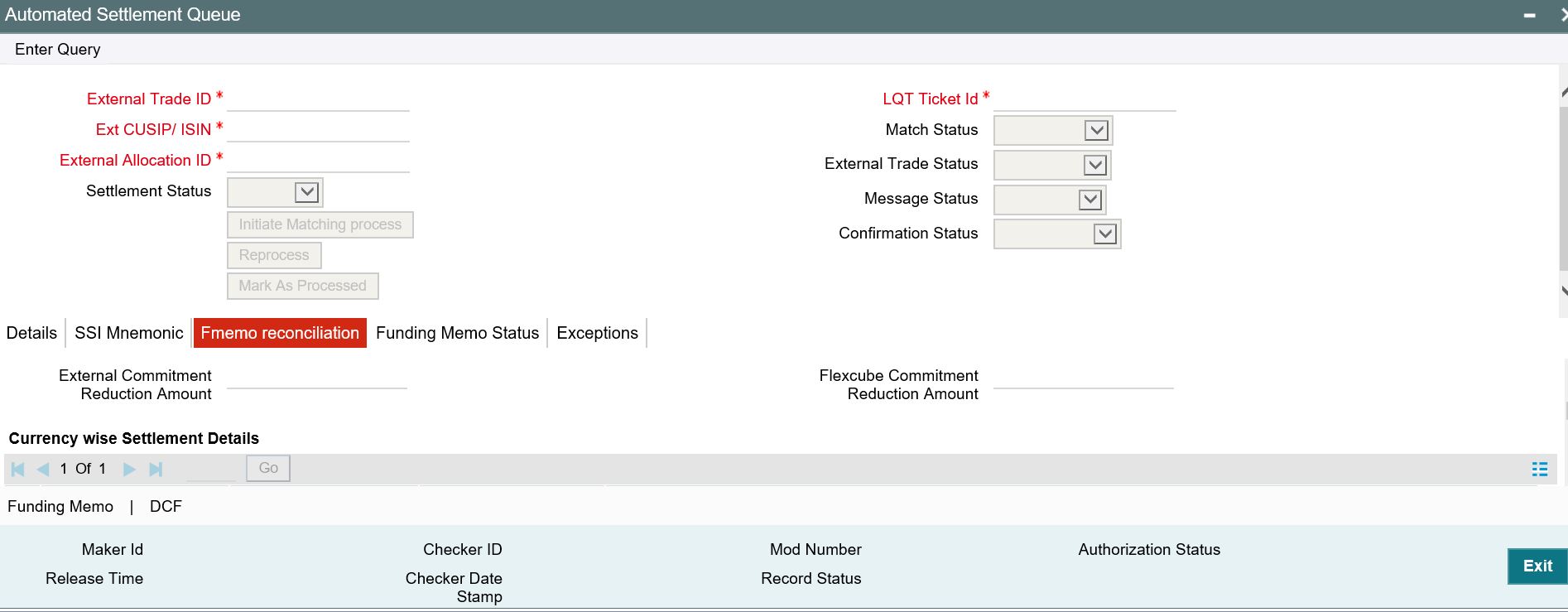 The funding Memo reconciliation is a manual process done by the user. System only displays the funding memo details of Oracle Banking Corporate Lending and Markit in this screen.
