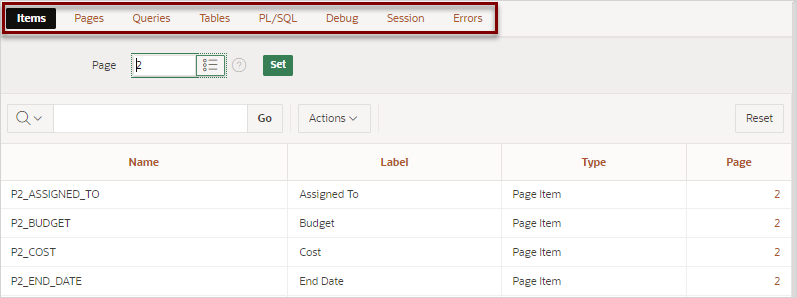 「検索」アイコンをクリックして、アイテム、ページ、問合せ、表、PL/SQLコードを検索し、デバッグ・レポート、セッション・ステートおよびエラーを表示します。