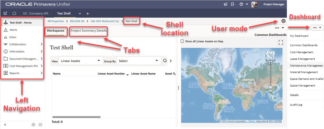 A shell is a “container” in which users can organize entities, such as projects or facilities. This shell is where users can organize business information in one place to make managing it easy. A shell can include the functions and features necessary to manage the information in that shell, such as a Schedule Manager, a Document Manager, and a Cost Manager.