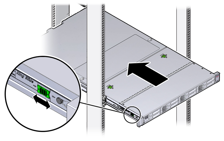 Simultaneously pull and hold the two green release tabs (one on each side of the server) toward the front of the server while you push the server into the rack. See Figure 6.13.