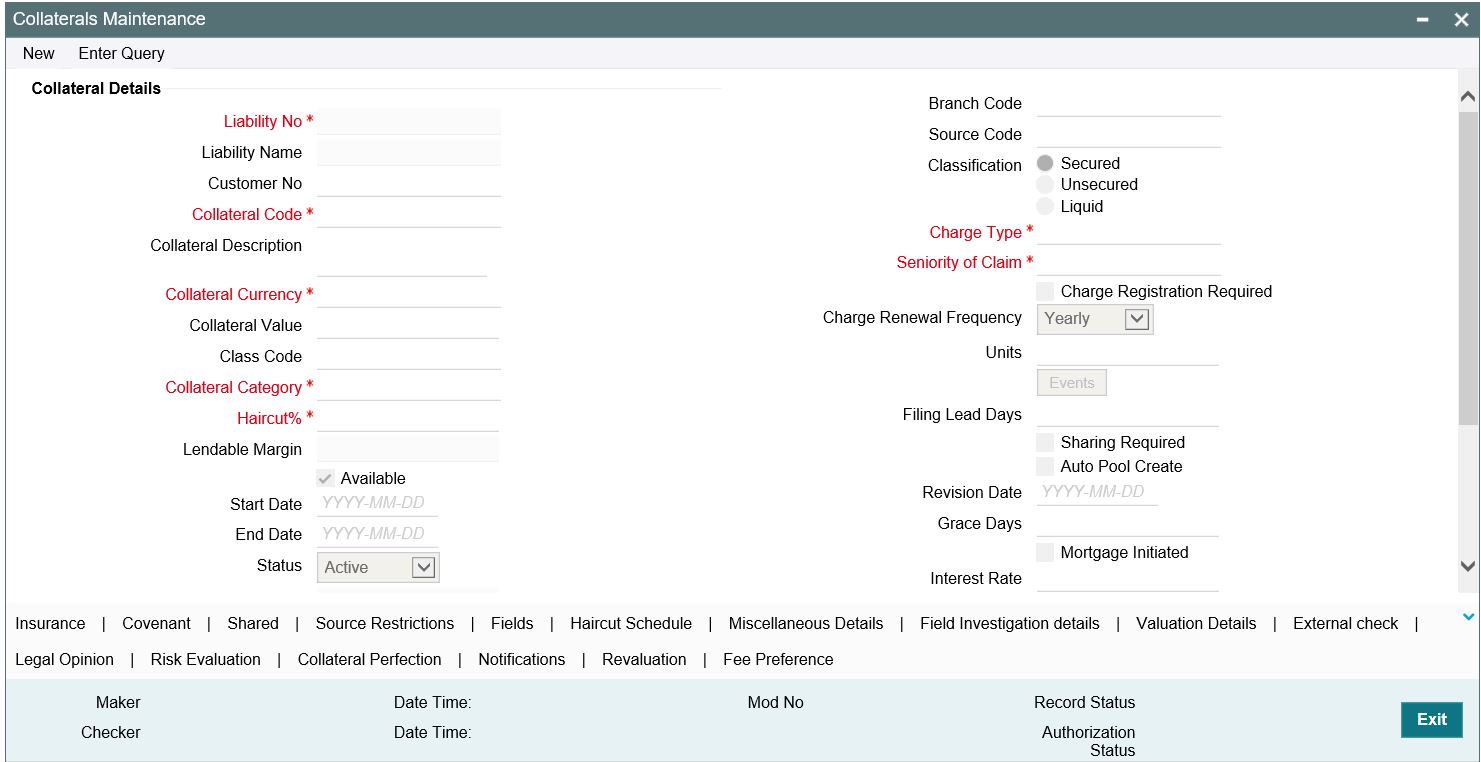 Collateral Types maintenance is used to capture all types of Collateral which your bank accepts. Collateral Types information would be required when creating a new collateral in the system.