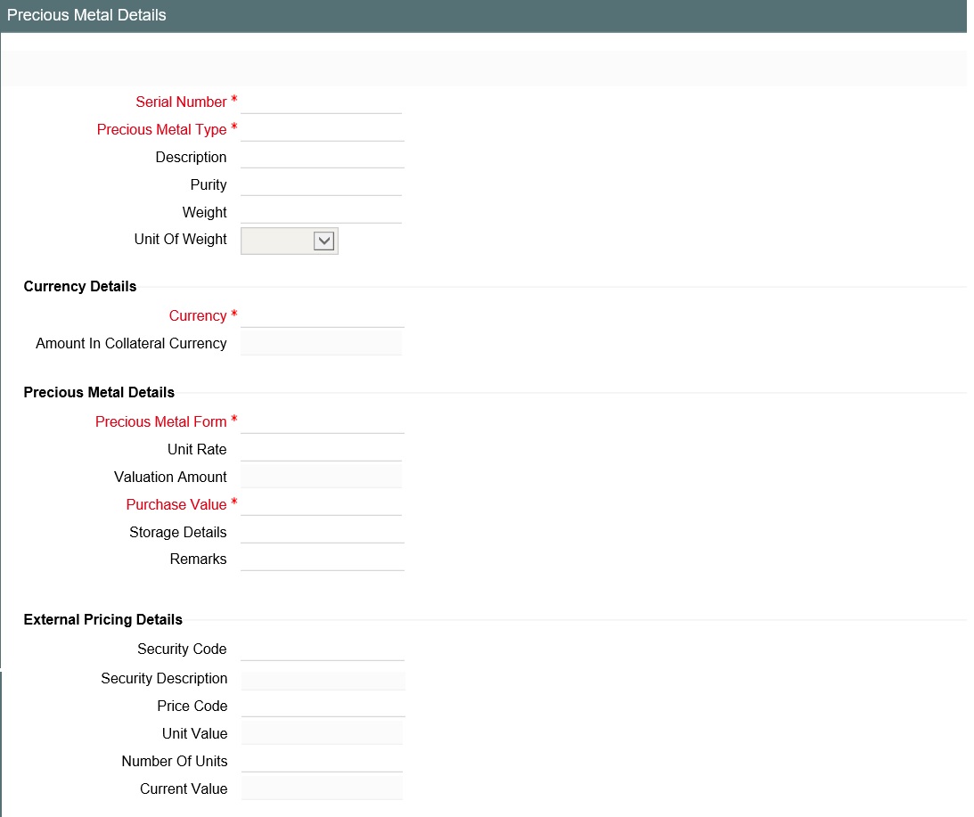 Using this screen, customer collateral of type commodities can be maintained. Multiple commodities records can be linked same customer collateral. Collateral value is updated duly considering amount of these commodities.