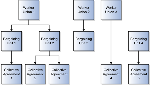 労働組合は、複数の交渉団体に関連付けることができます。ただし、交渉団体を関連付けることができるのは、1つの労働組合のみです。労働協約を関連付けることができるのは、1つの就業者組合と交渉団体のみです。労働組合または交渉団体は、複数の労働協約に関連付けることができます。