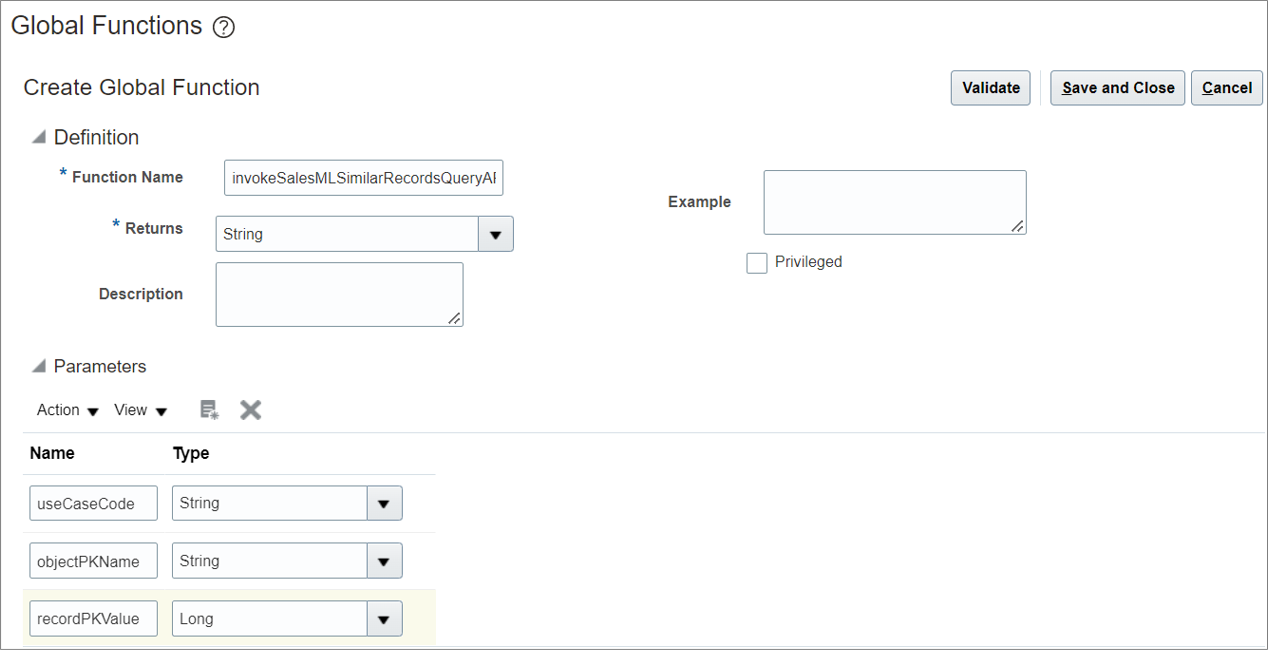 - 「グローバル関数の作成」ページで、関数名を入力します。 たとえば、invokeSalesMLSimilarRecordsQueryAPIのようにします。