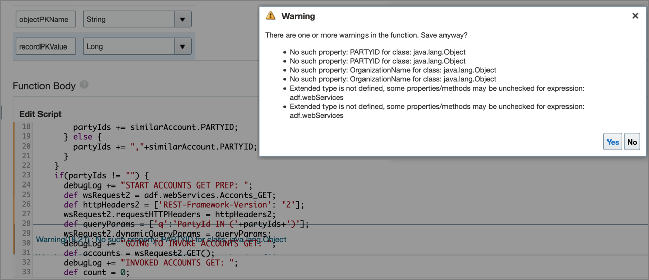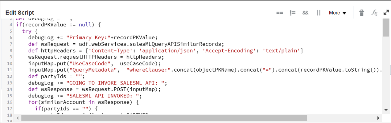 def inputMap = [:]; def accountNames = ""; def debugLog = ""; if(recordPKValue != null) { try { debugLog += "Primary Key:"+recordPKValue; def wsRequest = adf.webServices.salesMLQueryAPISimilarRecords; def httpHeaders = ['Content-Type': 'application/json', 'Accept-Encoding': 'text/plain'] wsRequest.requestHTTPHeaders = httpHeaders; inputMap.put("UseCaseCode", useCaseCode); inputMap.put("QueryMetadata", "whereClause:".concat(objectPKName).concat("=").concat(recordPKValue.toString()).concat(";numberOfRows:5")); def partyIds = ""; debugLog += "GOING TO INVOKE SALESML API: "; def wsResponse = wsRequest.POST(inputMap); debugLog += "SALESML API INVOKED: "; for(similarAccount in wsResponse) { if(partyIds == "") { partyIds += similarAccount.PARTYID; } else { partyIds += ","+similarAccount.PARTYID; } } if(partyIds != "") { debugLog += "START ACCOUNTS GET PREP: "; def wsRequest2 = adf.webServices.Acconts_GET; def httpHeaders2 = ['REST-Framework-Version': '2']; wsRequest2.requestHTTPHeaders = httpHeaders2; def queryParams = ['q':'PartyId IN ('+partyIds+')']; wsRequest2.dynamicQueryParams = queryParams; debugLog += "GOING TO INVOKE ACCOUNTS GET: "; def accounts = wsRequest2.GET(); debugLog += "INVOKED ACCOUNTS GET: "; def count = 0; for(account in accounts.items) { if(count == 0) { accountNames += account.OrganizationName; } else { if(count<5){ accountNames += ",\n"+account.OrganizationName; } else { break; } } count++; } } } catch (e) { debugLog += e.getMessage(); accountNames = debugLog; } } else { accountNames = "Not Available"; } if(accountNames == "") { accountNames = "Not Available"; } return accountNames; - 「検証」をクリックします。