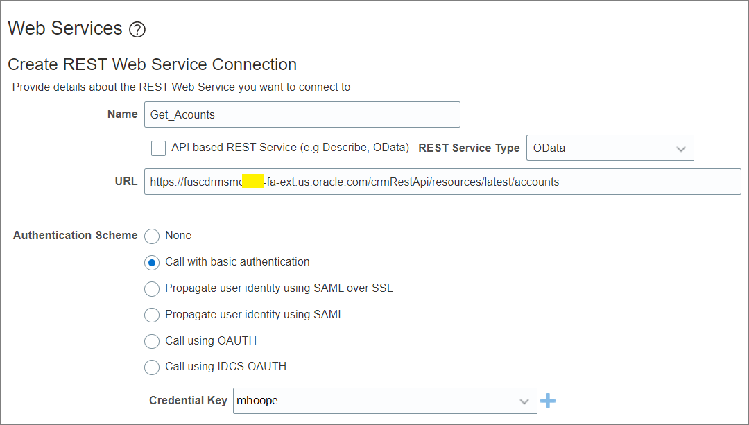 https://<host>/crmRestApi/resources/latest/accountsという形式で入力します。 たとえば、https://fuscdrmsmcxxx-fa-ext.oracle.com/crmRestApi/resources/latest/accountsのように入力します。 - 「認証スキーム」に「基本認証を使用して起動」を選択します。