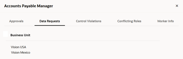 要求の要約情報を表示するには、ダッシュボードで要求IDをクリックします。次に、「アクセス要求承認」ダッシュボードからオープンされた要約レコードの例を示します。買掛/未払金マネージャという単一のロールが、ビジネス・ユニット・セキュリティ・コンテキストとともに要求されました。(セキュリティ・コンテキストの詳細は後ほど説明します。)そのバッジ(「1個の違反」)は、ロールが付与されると、その割当てが1つのコントロールに違反することを示します。