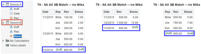 Source Aに対して「すべての行」データ・ブレンド・オプションを選択し、Source Bに対して「一致した行」データ・ブレンド・オプションを選択した場合、次の結果が表示されます。IN-7はSource Bに存在しないため、結果にはnullのRepとnullのBonusが含まれます。