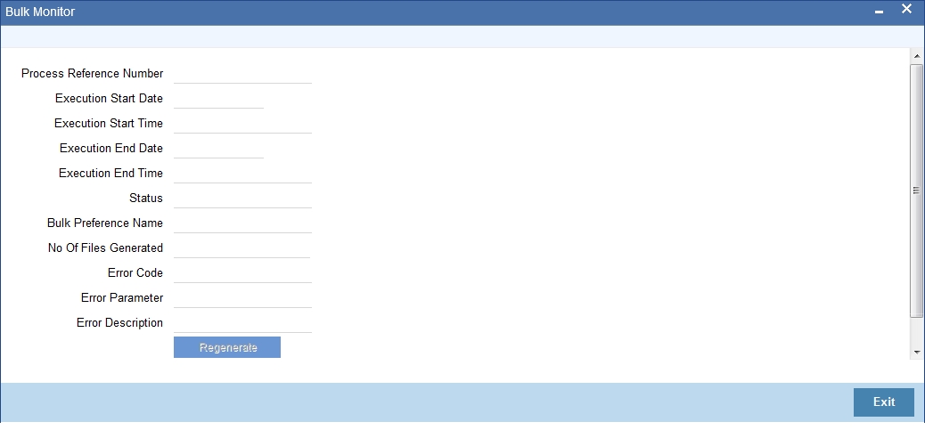 You can monitor the messages and executions in bulk using 'Bulk Monitor' screen. To invoke this screen, type 'MSSBLKMN' in the field at the top right corner of the application toolbar and click the adjoining arrow button.