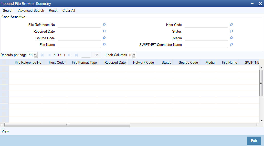 You can use the inbound file browser for searching and viewing the inbound files. To invoke the screen, type 'MSSIFBRW' in the field at the top right corner of the application toolbar and click the adjoining arrow button.