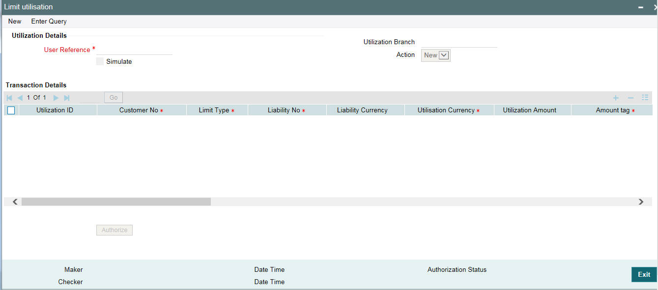 All utilization transactions maybe captured in their own external systems or through the ‘Utilization Transaction’ screen. The utilization details for each transaction taken place in the external product processor have to be sent to Oracle Banking ELCM through Gateway online Inbound or Gateway Batch Inbound process.
