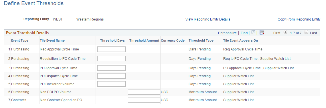 Use the Define Event Threshold page to define system level thresholds. A violation will appear for each Event on the Supplier Watch List when the transaction amount calculated or number of days pending exceeds the threshold established for the reporting entity.