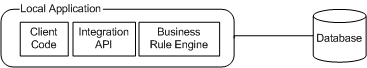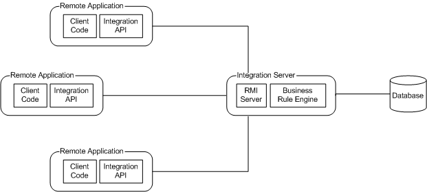 If you are using the P6 Professional Integration API, then you can use the API in Local Mode only. Java Remote Method Invocation (RMI) is not used, and the Integration API communicates directly with the business rule code in the server (the Business Rule Engine), as illustrated in the following graphic: