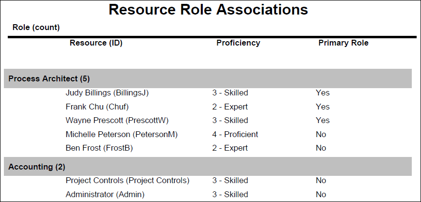 システム内のすべてのロールと各ロールに割り当てられているリソースのリストが表示されます。各リソースに対するプライマリ・ロールと熟達度レベルが識別されます。