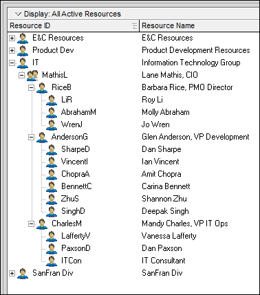 Vanessa Lafferty has restricted access with the root resources AndersonG - Glen Anderson, VP Development and CharlesM - Mandy Charles, VP IT Ops assigned. Vanessa sees the following resources in the resource dictionary: AndersonG, SharpeD, VincentI, ChopraA, BennettC, ZhuS, SinghD, CharlesM, LaffertyV, PaxsonD, and ITCon.