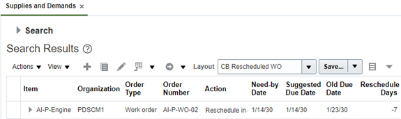 この例では、再スケジュールされた作業オーダー(つまり、提示期日が旧期日より前になったもの)について説明します。