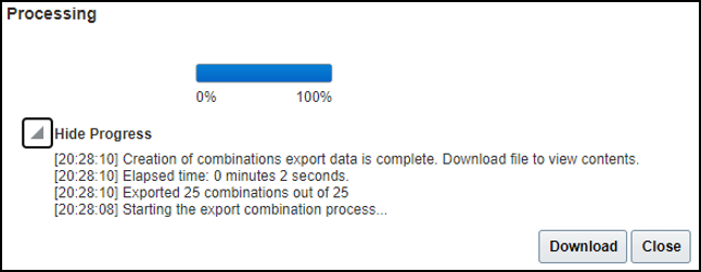 100%完了した「処理中」ダイアログの例を次に示します。相互検証の組合せセットには25個の組合せがあり、これらはすべてエクスポート済であり、ダウンロードの準備ができています。