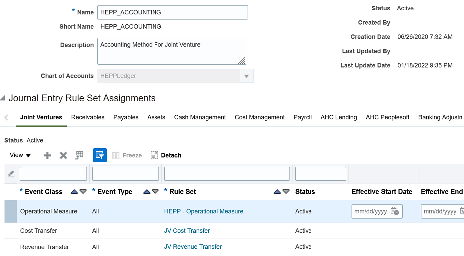 - ルール・セットの設定後に、「補助元帳仕訳ルール・セットの管理: 合弁企業」ページに戻り、「処理」メニューを使用して新しい仕訳ルール・セットをアクティブ化します。