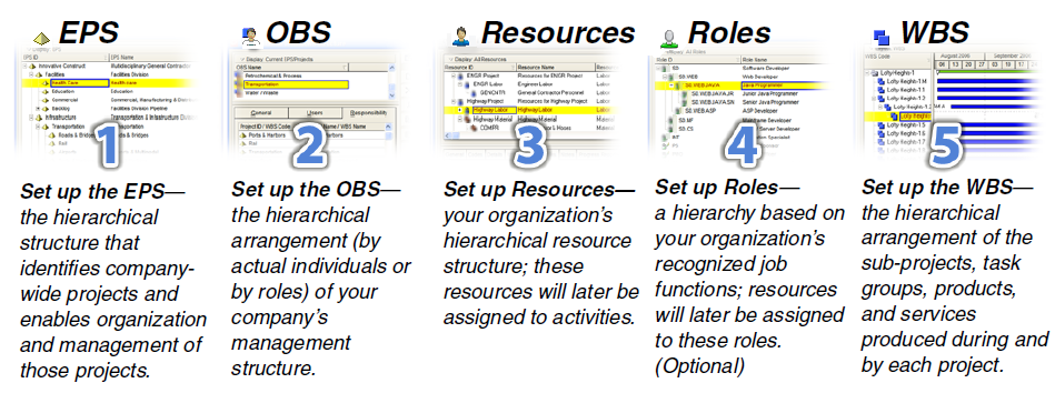Les administrateurs structurent les hiérarchies EPS et OBS en collaboration avec les responsables de programme et les chefs de projet. Une structure EPS peut comprendre plusieurs noeuds racine, ce qui permet de regrouper des types particuliers de projet, tels que des modèles de projet ou des projets à haut risque. Au sein de chaque noeud racine, vous pouvez répartir une structure EPS en plusieurs noeuds EPS afin de classer les types de projet.