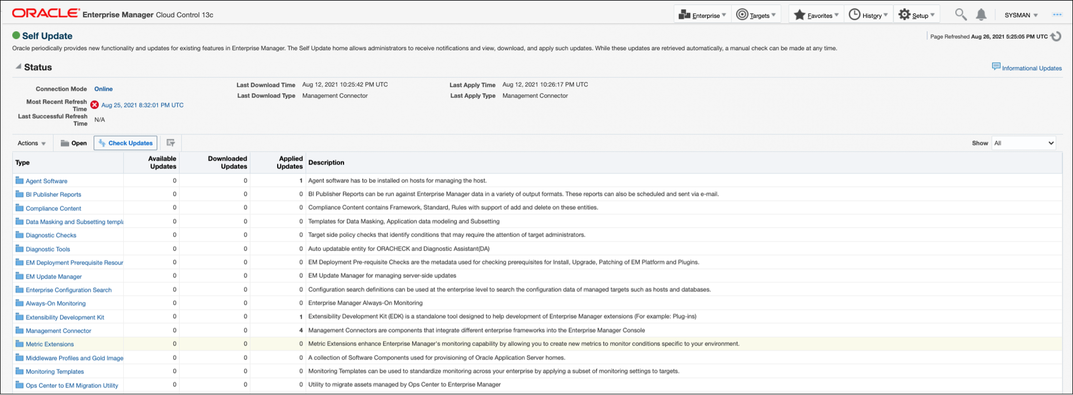 「自己更新」はオフライン・モードでも設定できます。詳細は、『Oracle Enterprise Manager Cloud Control管理者ガイド』のオフライン・モードでの更新の適用を参照してください。
