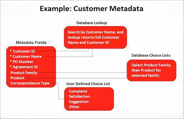 図1-4は、Customerワークスペースに定義されたメタデータ・フィールドを示しており、それらは適用時にドキュメント・プロファイルに組み込まれます。たとえば、Correspondenceドキュメント・プロファイルには、Customer IDCustomer NameProduct FamilyProductおよびCorrespondence Typeメタデータ・フィールドが含まれます。