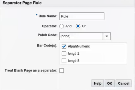 ルール内でAndまたはOr条件を指定するほかに(図7-13を参照)、ルール間で、AndまたはOr条件を指定します(ルール表の「演算子」フィールドで、AndまたはOrを選択)。たとえば、各ルールが一致の方法(パッチ・コードまたはバー・コードまたは空白ページ)を提供しているが、ルール1およびルール2の両方がセパレータ検出に一致していることが必要になる場合があります。