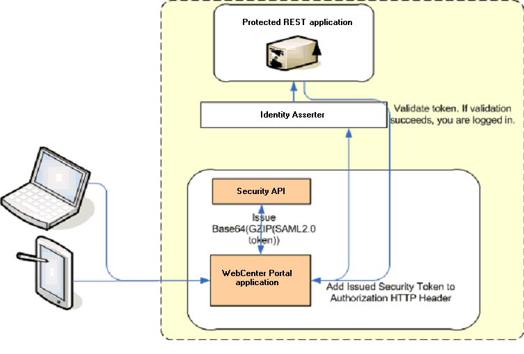 WebCenter Portalおよび他のOracle WebLogicアプリケーションでは、それらのアプリケーションで必要な方法でREST APIを使用して情報を表示できますが、そのようなコールは中間層から発信されるため、ユーザーはログイン資格証明を再度入力するよう求められます。これに対処するには、ユーザー・アイデンティティがHTTPヘッダーに伝播され、OPSSトラスト・サービス・アサータによってアサートされるときに境界認証を使用します。