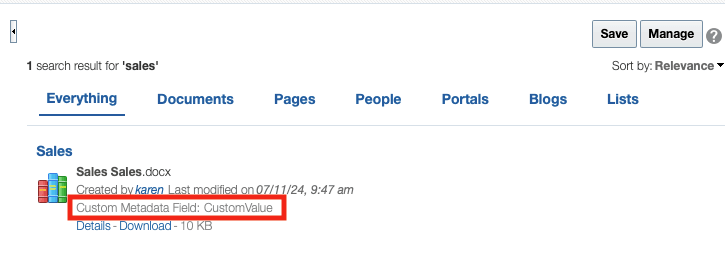 新しく作成したメタデータ・フィールド値をポータル内のドキュメントに追加します。この例では、CustomMetadataFieldです。