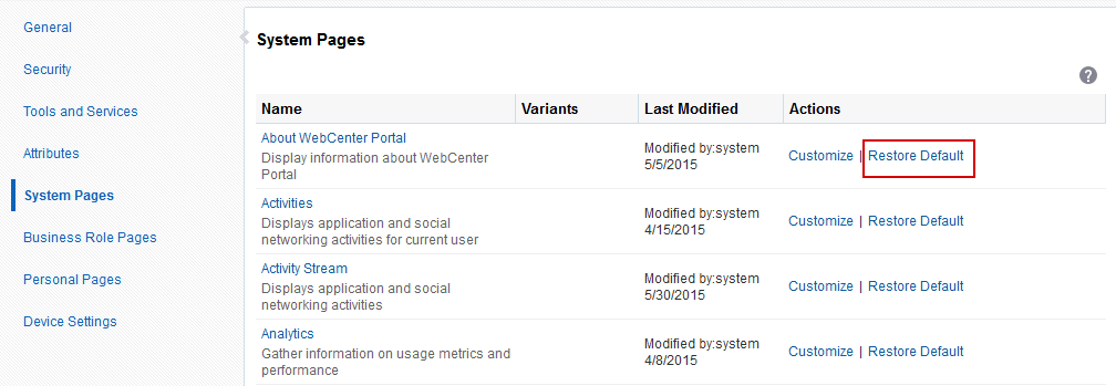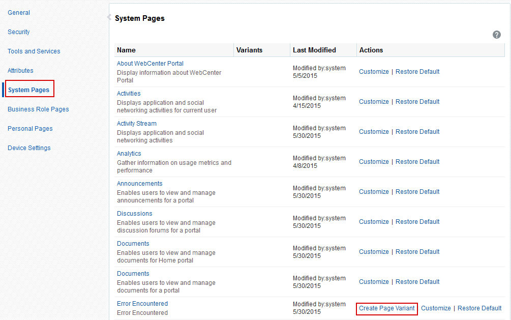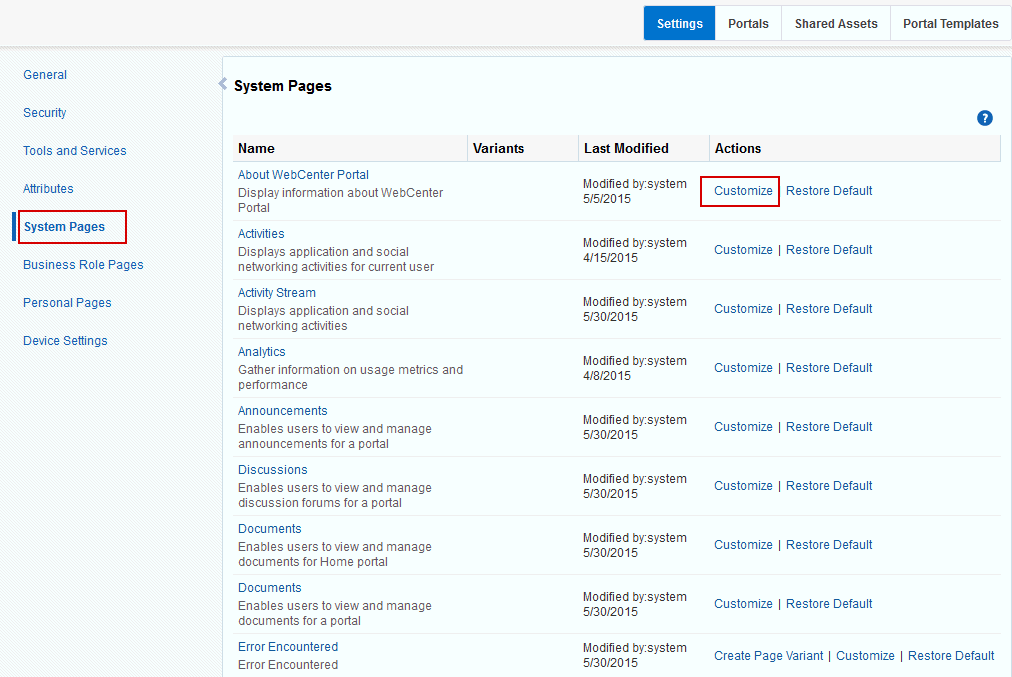 WebCenter Portal管理の「システム・ページ」ページでは、WebCenter Portalで使用可能な組込みシステム・ページを表示してカスタマイズできます。