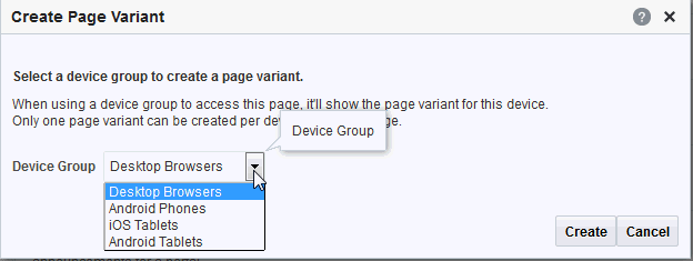 表示される「ページ・バリアントの作成」ダイアログで、「デバイス・グループ」ドロップダウン・リストからページ・バリアントを作成するデバイス・グループを選択します。