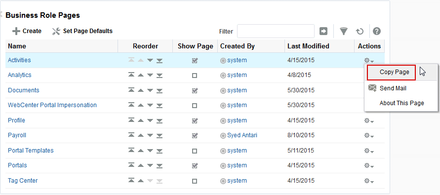 図37-15 組込みビジネス・ロール・ページの「ページのコピー」オプション